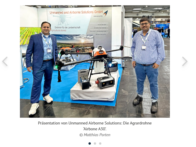Unmanned & Airborne Solutions GmbH wird als indisches Unternehmen mit Niederlassung in Landau (Rheinland-Pfalz) beschrieben, das mit der kostengünstigen Agrardrohne Airborne A30 einen attraktiven Einstieg in die Drohnentechnologie für den Steillagenweinbau bietet.